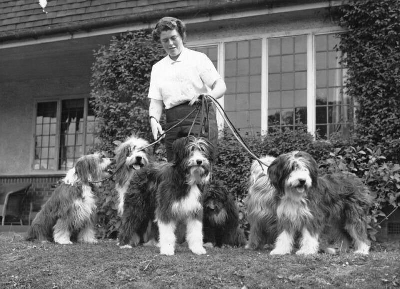 (L) Jeannie en Baily of the Bothkennar (R) de voorouders van de huidige Bearded Collie Met hun eerste nestje in het midden.